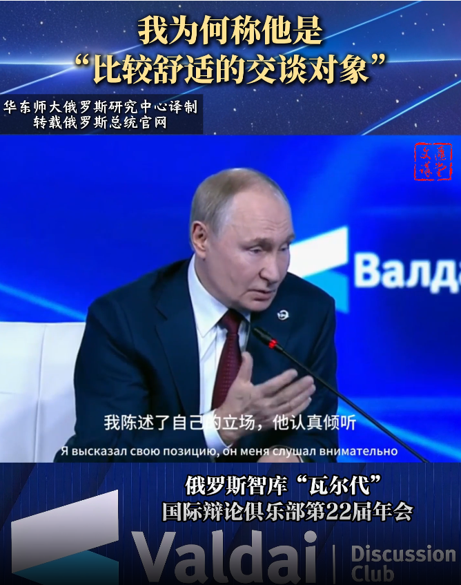 一年一度的俄罗斯智库“瓦尔代”国际论辩俱乐部年会9月29日至10月2日于索契举办了第22期。自2006年即每年受邀参会的华东师大俄罗斯研究中心主任冯绍雷,在今年的闭幕全体会议上再次得到机会,就中俄美三方互动及其意义提问普京总统。普京回顾了阿拉斯加俄美峰会上的一些细节,并谈及与特朗普交流的内容和对特朗普的印象。他认为“俄美修复双边关系对所有人都有好处。”