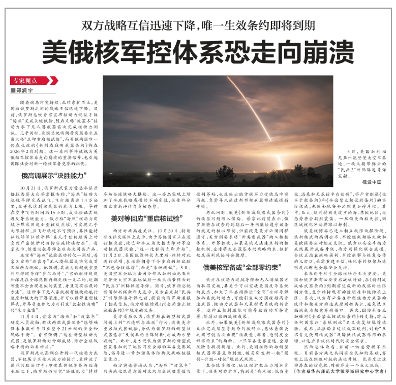 与此同时,俄美《新削减战略武器条约》的续签问题陷入僵局。普京此前曾表示,俄罗斯将在该条约到期后一年内继续遵守该条约规定的核心限制,但前提是美方必须同样遵守;美方则要求将“新类型武器”纳入核控体系。外界担忧,如果美俄无法建立新的核控机制,全球将失去最基本的战略约束,核扩散及误判风险将会骤增。