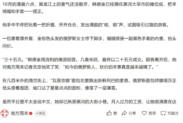 “三十五元。”韩德金用流利的俄语回答。几番来回,最终以二十五元成交。顾客离开后,他对南方周末记者无奈地笑了笑:“如今的俄罗斯人,砍价的本事真是越来越精了。”
