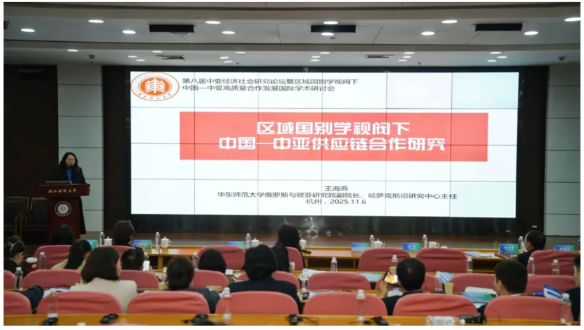2025年11月8-9日,王海燕老师赴杭州参加第八届中亚经济社会研究论坛暨区域国别学视阈下中国-中亚高质量合作发展国际学术研讨会,该会议由浙江财经大学主办,浙江财经大学国际学院、中亚研究院、经济学院承办,新疆霍尔果斯经济开发区管委会、杭州市钱塘区社会科学界联合会、新疆伊利师范大学“一带一路”发展研究院协办。来自哈萨克斯坦共和国总统直属战略研究所、乌兹别克斯坦世界经济与外交大学、哈萨克斯坦国立欧亚大学、哈萨克斯坦阿斯塔纳国际大学、哈萨克斯坦阿拉木图管理大学、乌兹别克斯坦塔什干国立东方大学、吉尔吉斯斯坦德隆电视台的10余位中亚国家学者,与来自教育部高校国别和区域研究工作秘书处、浙江省贸促会、中国社科院俄罗斯东欧中亚研究所、浙江财经大学、华东师范大学、浙江大学、西北大学、西安外国语大学、伊利师范大学、杭州码猿教育科技有限公司等国内外共60余名政企学界专家学者作专题交流,200余名中外师生现场聆听。