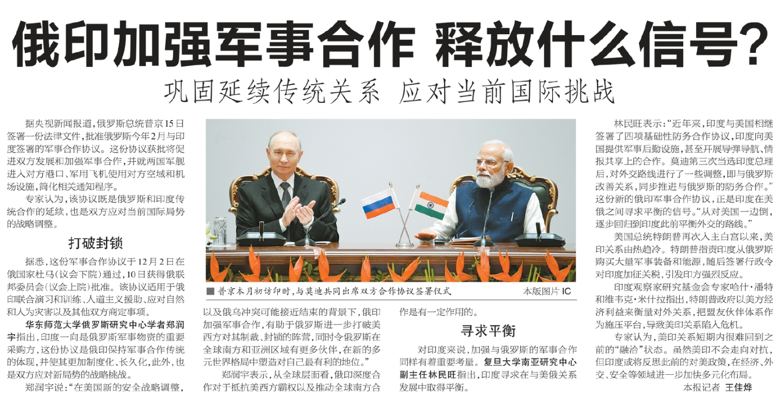 郑润宇接受《新民晚报》采访,评俄印加强军事合作