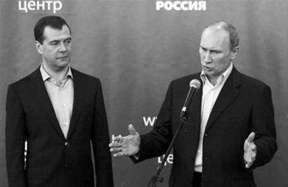 4日,在统一俄罗斯党总部,俄罗斯总理普京(右)和总统梅德韦杰夫在国家杜马选举投票结束后出席新闻发布会。